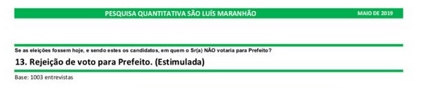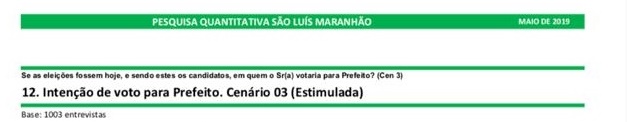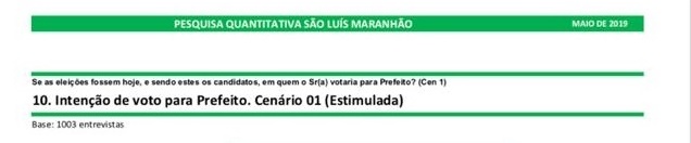 O Instituto Escutec realizou levantamento sobre a corrida eleitoral de São Luís entre os dias 1 e 5 de maio, entrevistou 1.003 eleitores e tem um um nível de confiabilidade de 95% com margem de erro de 3,1% para mais ou para menos.